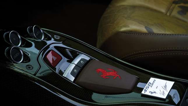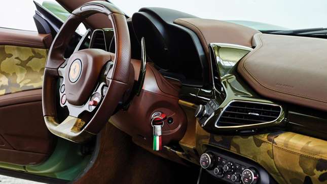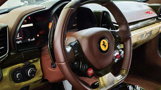 Inside, Mr. Elkann opted for dark brown leather, with contrast camo inserts, camo trim on the steering wheel and dash, and contrast rosso horses stitched into the headrests (themselves camo’d up too).