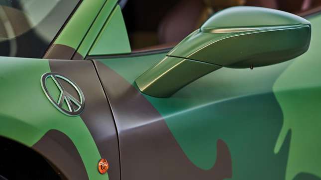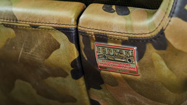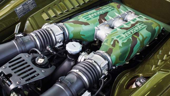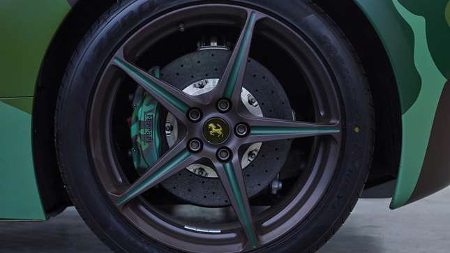 It’s camouflaged, for goodness sake. The one-off paint-scheme is matched up with peace signs in place of the Ferrari ‘Scuderia Shields’ on the front wings. The wheels were also painted in dark green, while the calipers of the carbon ceramic brakes and even the engine cover were painted in camouflage colors. You must admit, it is disturbingly excellent. Others disagree. Others are wrong.