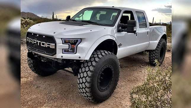 It’s the work of F250R, which is based in Tucson, Arizona. While the regular Raptor is based on the Ford F-150, the MegaRaptor is based on the Ford F-250 or 350 Superduty—a much bigger truck, with much better towing capacity. F250R strips them back to their component parts, before fitting massive wheels and tires, special suspension (a four-inch Icon lift with Bilstein shocks) and extra fiberglass bodywork (and new headlights) designed to mimic the latest Raptor’s "sexy sport look."