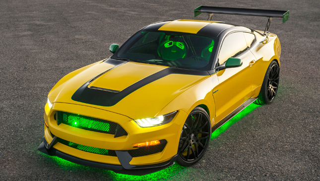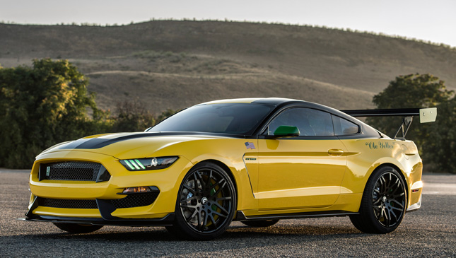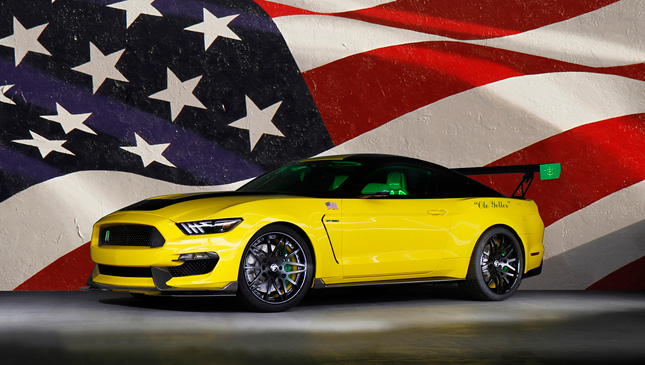 The car features “Ole Yeller” badging and accents, carbon-fiber trim pieces, and mirror lamps that project an image of the Mustang aircraft on the pavement. Inside, one will find floor mats with special logos, Recaro seats, and aviation-inspired gauges. All this is finished off in a special custom-yellow exterior color.