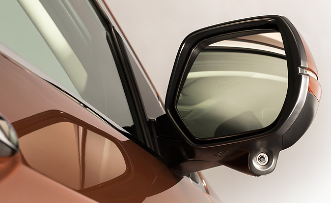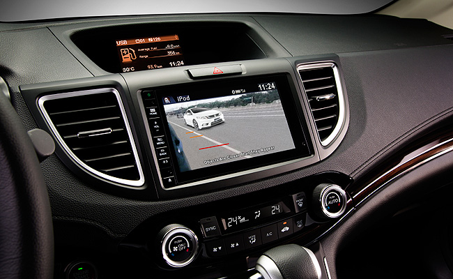 The biggest update to the new CR-V, however, is Honda's exclusive LaneWatch technology, which utilizes a small camera located underneath the passenger-side mirror. The system works by projecting a live display on the screen, of what the camera captures to the right and slightly behind the car as the driver signals a right turn, thereby eliminating blind spots.