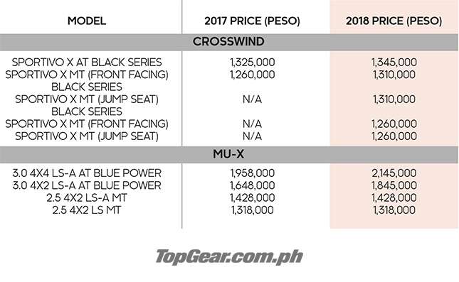Today, Isuzu Philippines released its new prices inclusive of the new excise taxes under the Tax Reform for Acceleration and Inclusion (TRAIN) for 2018. Well, at least some of them. The Japanese carmaker only revealed new figures for the Crosswind and the MU-X. Still, they're very popular models so this news is worth talking about.