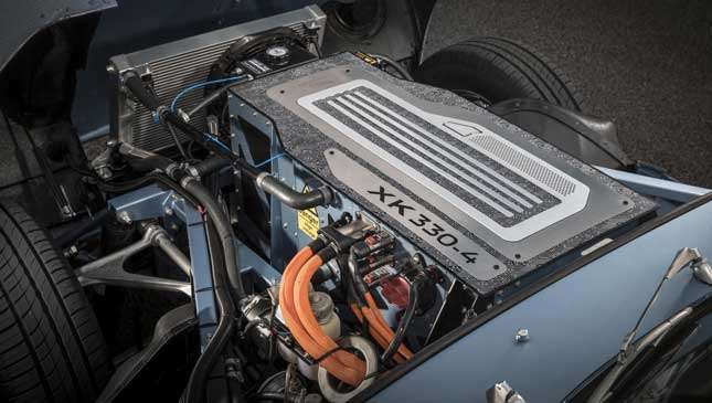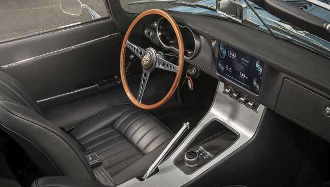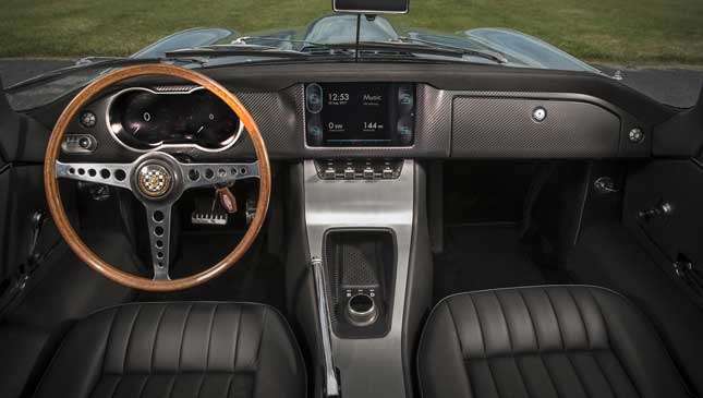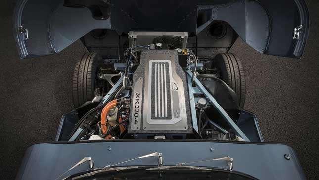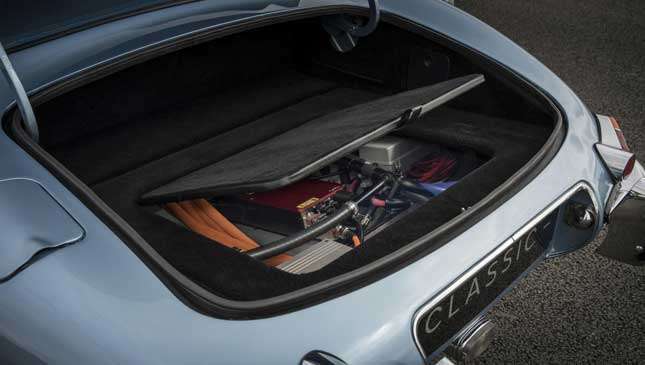 TopGear.com had a preview, and we're told that sitting in an E-Type as it whirrs off in near-silence is a genuinely spooky experience. The liquid-cooled battery pack fits as if to the manor born right where the engine usually sits, with the electric motor and reduction gear just behind it (where the gearbox is sited in the original). A new prop shaft sends power to the same differential and final drive. The inverters and control units sit snugly in the boot.