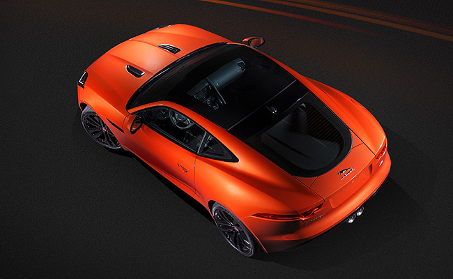 To keep the F-Type Coupe's roofline low and sleek while giving it the optimum amount of interior space, Jaguar utilized a high-strength, hydro-formed aluminum alloy beam that runs from the front of the A-pillar through to the back of the D-pillar, through the door opening line and back to the rear-quarter window. A rear spoiler resides within the tapered shut-line of the tailgate, which then rises and exerts 120kg worth of downforce when the F-Type Coupe reaches 110kph and then lowers when the speed drops below 80kph.