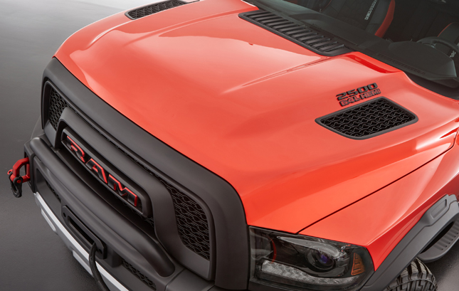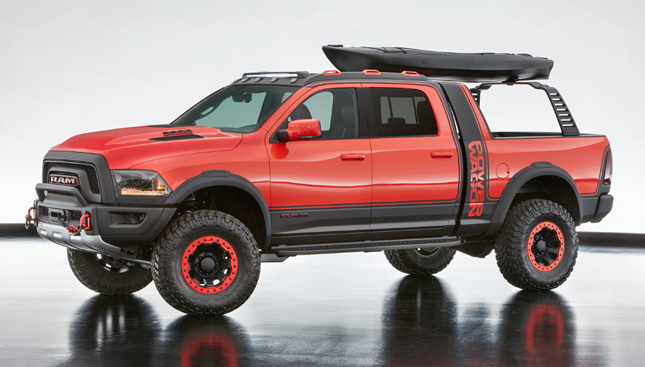 Next up is the Ram Macho Power Wagon, a tribute to the company's heavy-duty pickups of old. With gigantic 37-inch Nitto Trail Grappler MT tires and 18-inch wheels, it's hard to imagine the company thinking of any other name for it. What's more, the vehicle's storage is equally impressive, thanks to a sliding RamRack roof system. Other add-ons include off-road running boards, an LED light bar and clearance lights, bright silver skid plates, and an eye-catching Mango color finish.