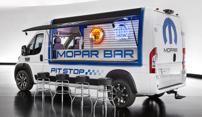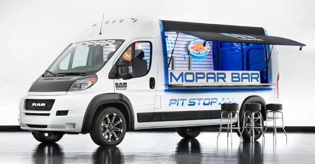 Our local food trucks have nothing on the company's party on wheels, the RAM ProMaster Pit Stop. A drop-down bar counter opens out from the side, and its cargo area has been modified with keg refrigeration capacity to serve drinks via a Mopar T-handle, a cue ball and pistol grip taps. This one runs on 20-inch Satin Black wheels and comes wrapped in checkered flag Pit Stop graphics.