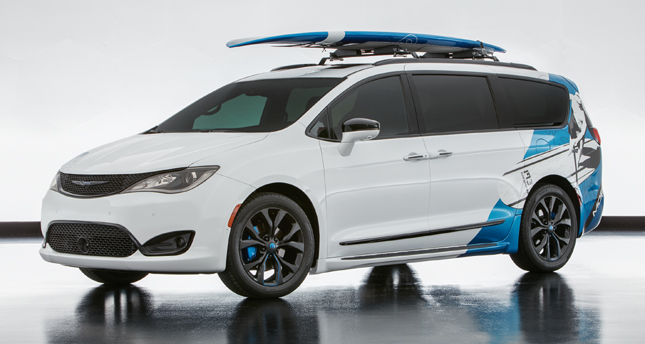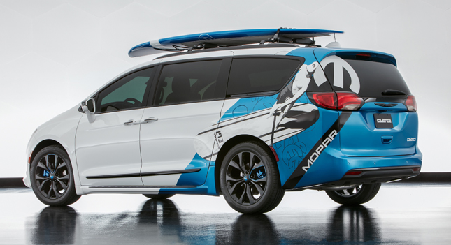 Capping things off is the Chrysler Pacifica Cadence concept. Mopar fitted the family vehicle with 20-inch tri-color wheels, a Thule surfboard carrier, Blue "Omega M" logo, a ton of interior cargo options, and even a pet kennel for the family pet—effectively transforming a mundane mommy van into a fun road trip companion. It's not exactly a mind-blowing customization, but still pretty neat.