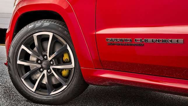 First off, the eight-speed automatic transmission has been strengthened while the rear driveshaft has been bolstered and connects to a stronger, stiffer rear axle. There are also the largest-ever front brakes fitted to a Jeep—400mm two-piece vented rotors with six-piston yellow calipers from Brembo to help try and shave off that top speed before you hit something immovable at high speed.