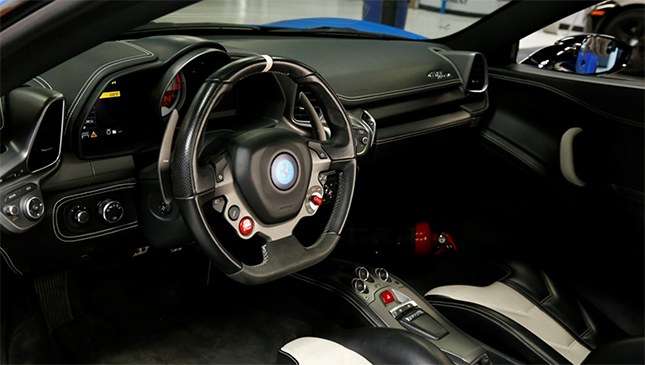 Inside the cabin, West Coast Customs took charge of the design, displaying the flair that has made the American tuning house famous. To wit, there’s some black and white leather seats, and the Ferrari emblem in the steering wheel is now blue, instead of yellow. Zagato, eat your heart out.