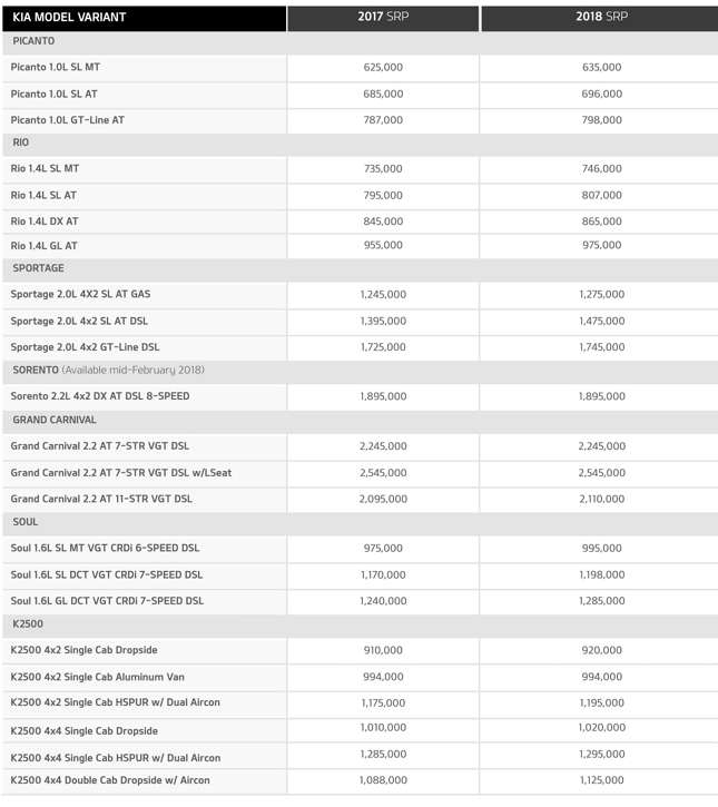 Other than the models mentioned above, no Kia vehicle saw an increase in price over P30,000. The popular Picanto city hatch's GT-Line variant only increased by P11,000, and the Rio 1.4 GL subcompact hatchback by P20,000. With the exception of its 11-seat model, the Grand Carnival maintained its 2017 pricing, too.
