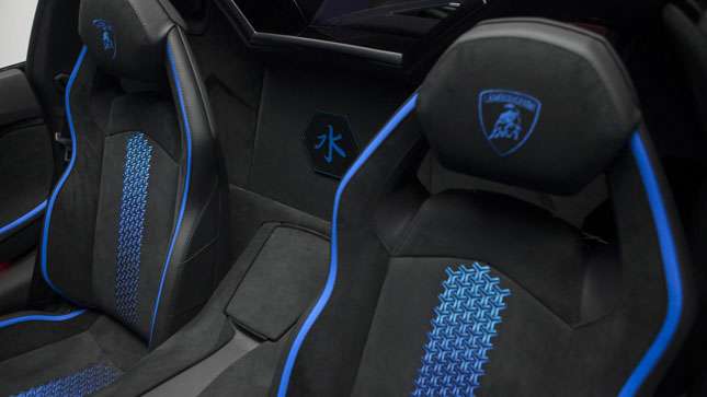 ‘Water’ was premiered at the show, an Aventador S Roadster featuring special shading effects to go from blue to black that took over 170 hours of labor to create. Other features include embroidery on the seats and a hardtop that evokes the Japanese symbol for bamboo. Internal stitching matches the outside colors, and is complemented by a hexagonal carbon fiber plate with the symbol for the car’s namesake.