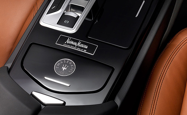 For starters, the car's exterior is finished in Grigio Maratea. Other special exterior features are gloss-black door handles, shadowline trim, and 20-inch silver-forged wheels. The interior, meanwhile, is clad with premium leather "in Cuoio" with contrast stitching on the seats, dashboard and armrests, and piano-black lacquer trim. The Maserati trident logo is also stitched onto the headrests, and a special Neiman Marcus Edition number badge and Maserati's 100th anniversary logo are also placed strategically on the center console.