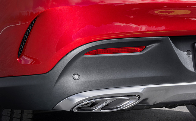 The vehicle bears the stylistic feature of all modern Mercedes-Benz coupes, with the low greenhouse, single-louver upright sports grille framed by three-dimensional all-LED headlights, short overhangs, and forward-sloping, power-dome hood. Discreet references to its SUV nature are also plentiful, like the illuminated running boards and chrome-plated front and rear underride guards.
