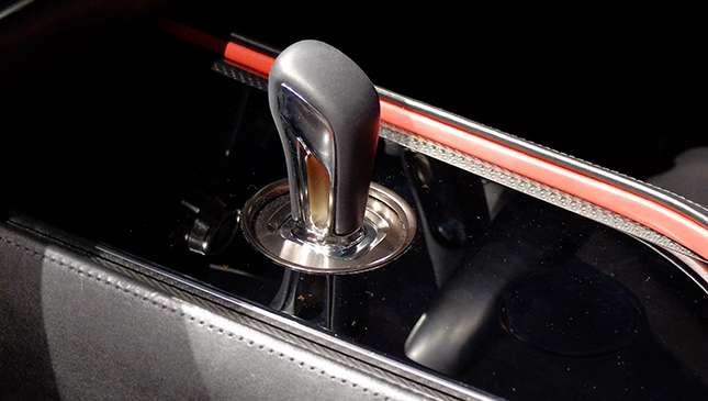 Finally, the interior is minimalist, but has a fair bit more going on compared to the outside. There’s an infotainment screen that stretches along the dashboard, a classy driver’s zone, beautiful gauges, and a snazzy shifter sitting quietly in the middle of it all. The car’s red paintjob carrying over inside via trim is a nice touch as well.