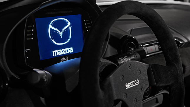 The Speedster Evolution in a White Ether finish is equipped with a Racing Beat custom center exit exhaust, Sticky Finger graphics, 17-inch RAYS 57 Transcend Gram wheels, BF Goodrich Rival G force R1 225/45 R17 tires, an AIM MXS data logger, carbon fiber Mazda Design aero kit, custom trim seats, a stock MX-5 brake package, and MX-5 Cup adjustable suspension dampers and springs. Of course, chopping your Miata's roof off won't be as easy as looking for these parts.