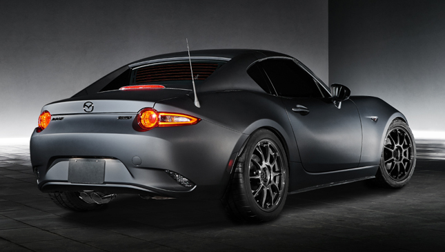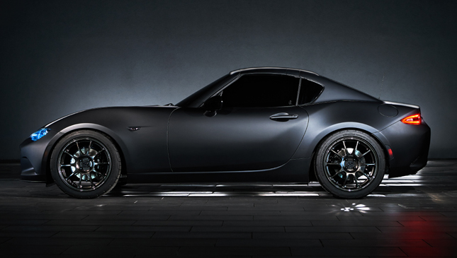 The hardtop MX-5 RF Kuro in Satin Black Metallic is fitted with an OpenFlash Performance center exit exhaust, more Sticky Finger graphics, 17-inch RAYS Global MX-5 Cup wheels, BF Goodrich Rival G Force 215/45 R17 tires, Brembo dual piston front calipers, and the same MX-5 Cup suspension as the Speedster.