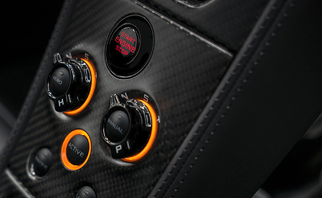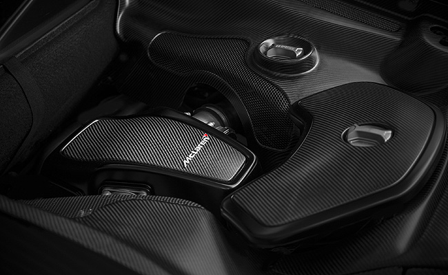 The carbon-fiber element continues in the cabin with fixed-back racing seats that are based on the lightweight design found in the McLaren P1 and are not only 15kg lighter than the standard seats but also position the occupants lower in the car. Also, the satin carbon-fiber highlights are repeated here and are further enhanced by contrasting gloss-black finish on the switchgear and bezels.