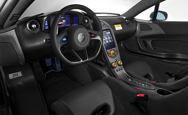 The bespoke P1's interior makes extensive use of carbon fiber and Alcantara, with the latter material used on the steering wheel. The lightweight carbon-shell racing seats are fitted with a four-point harness, while subtle contrasting details are used with Stone Gray binding and stitching on all upholstery and McLaren Orange accents on the center console.