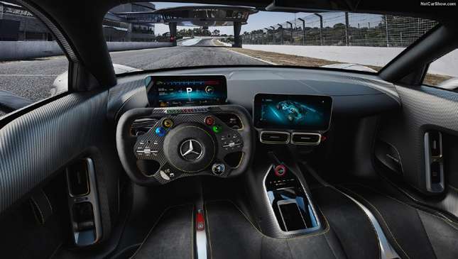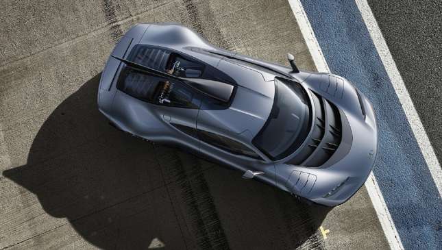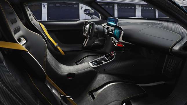 This is one of the rare occasions where the company's trademark grille is absent. In its place is a three-pointed star decal on the leading edge of the nose. On the sides we see curved front fenders which flow into the rear haunches. Down low are air channels, flaps and end-plates that aid the car's extreme aero. There's a sleek greenhouse with an intake above it, too, and a long central shark fin that improves cornering stability. Dominating the rear is a prominent two-section diffuser and a central-mounted exhaust with two smaller accompanying pipes. It rides on 19in or 20in forged aluminum wheels with carbon-fiber semi-covers.