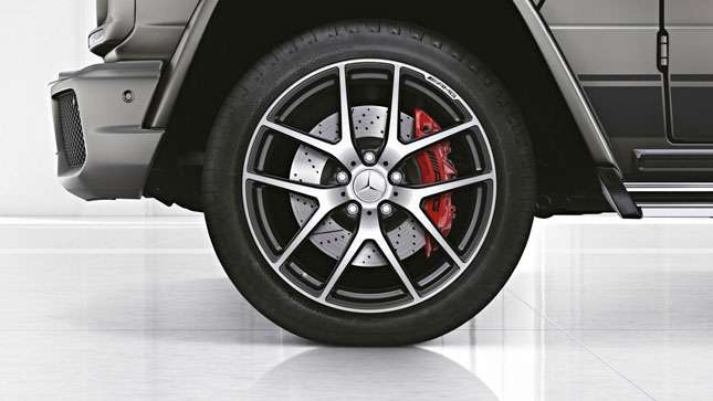 Anyway. The visual cues come courtesy of a stainless steel underride guard plus highly important AMG racing stripes along the doors. It even includes the spare wheel cover painted in the G’s body color. On the G63, you get twin-spoke light alloy wheels coated in a matte black high-sheen finish, whereas the G65 gets ceramically polished light-alloy wheels. Optionally available are the chunky 21in light-alloy rims in black, with high-sheen rim flanges and side rub strips with inserts in carbon-fiber. Tick this option.