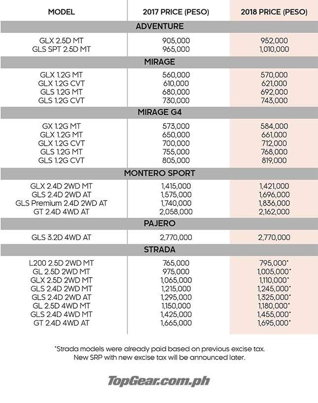 Strangely, the price list provided to us by the company shows an increase for the Strada, which, as a pickup truck, should not be affected by higher excise taxes. There is a note though stating "Strada models were already paid based on previous excise tax. New SRP with new excise tax will be announced later." We've also reached out for clarification regarding this matter.