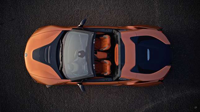 The Roadster is very similar to the Coupe, using the same carbon-reinforced plastic core, whose rigid structure has maximized the size of the roof opening and negated the need for lots of extra strengthening. So the Roadster weighs just 60kg more than standard, at 1,595kg, while it retains the bold dihedral doors, albeit frameless versions.