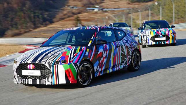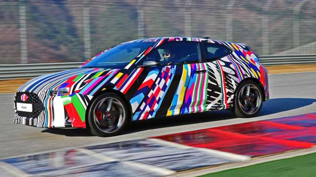Rather than hiding the styling of the new 2018 Veloster under an ugly camouflage wrap, Hyundai’s chosen the opposite tactic: MAXIMUM color. The retina-assaulting patterns are part-BMW art car, part-accident in a barcode factory, but are we the only ones brave enough to think they ought to appear on Hyundai’s paint options list?