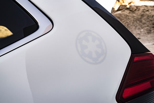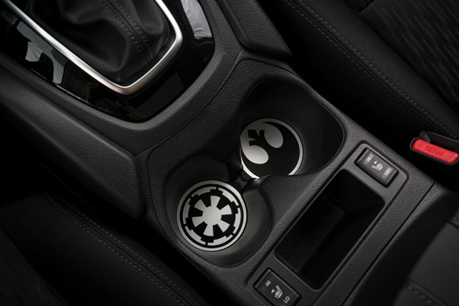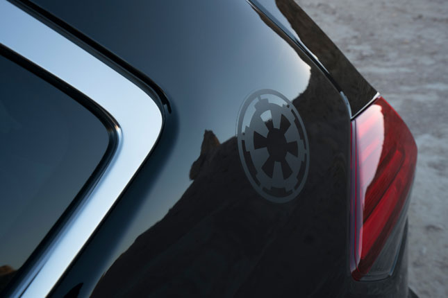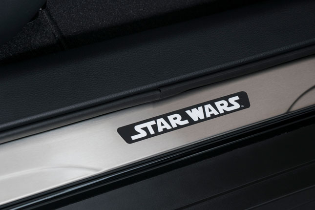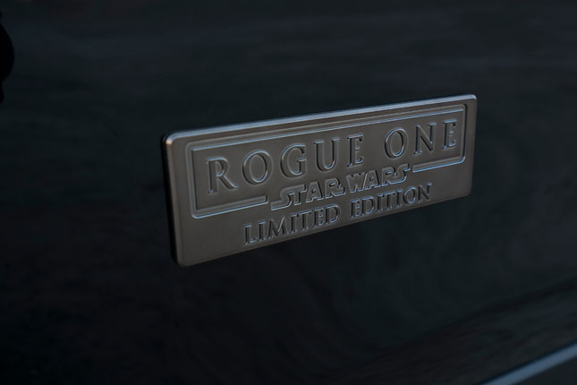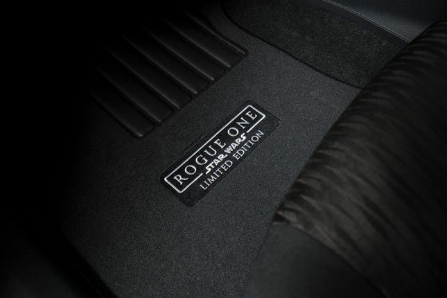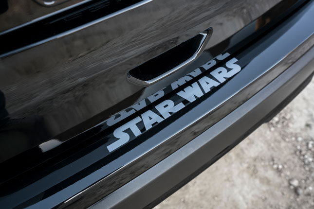 The aesthetic tweaks on the outside can be found on the D-pillars, rear bumper protectors, and on the front doors. Inside, you can find Star Wars decor on the floor mats, kick plates, cupholders, and even in the accent lighting. As an added bonus, each unit comes with a full-size Death Trooper collectible helmet.