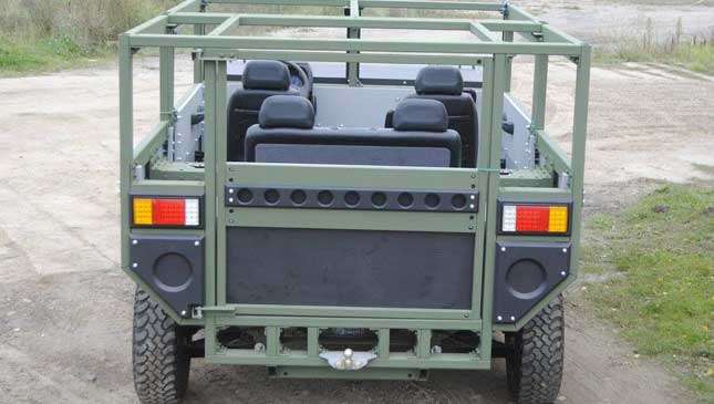 The Marston Mat-looking panels with circular holes allow armor plating to be bolted on. V-shaped armoring can also be bolted on underneath for added protection against pesky roadside explosives. Like its exterior, the interior is quite utilitarian. Instead of a full-width dashboard, it features a driver-side assembly which contains the gauge cluster and a switchgear panel. Other than that. you get two front bucket seats and a rear bench seat for two occupants.