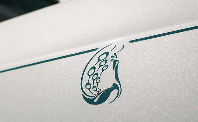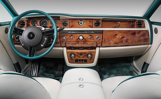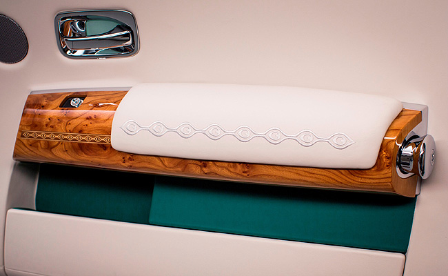The Maharaja Phantom Drophead Coupe is clad in Carrara White, and has a peacock emblem in honor of India's national bird, as well as an Emerald Green coachline. The car's fabric top comes in Deep Green, and when it is retracted, it reveals a deck with a Peacock emblem integrated into the marquetry to complement the peacock detail on the hood.