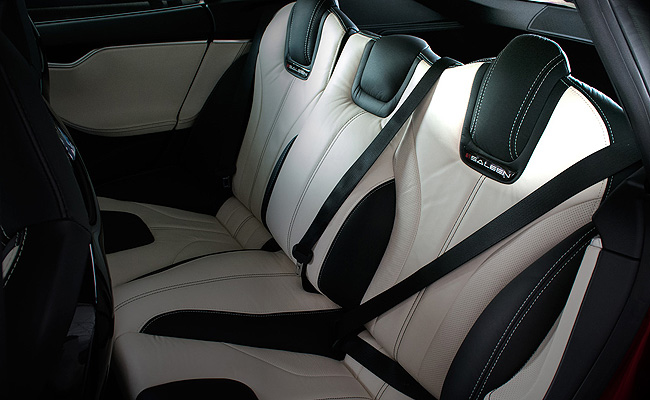 Saleen also worked on the interior, with the black leather seats being contrasted by perforated leather accents and Alcantara suede inlays to provide "a true luxury atmosphere." The center console has also been redesigned, giving the front-seat occupants additional center storage, a personal electronic device pocket, and a cupholder all within arm's reach. In addition, the front and rear seats have also been remolded to create four full-bucket seats complete with added bolstering, while the door panels and a full leather-wrapped dashboard feature hand-sewn contrast stitching.