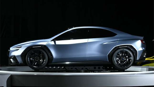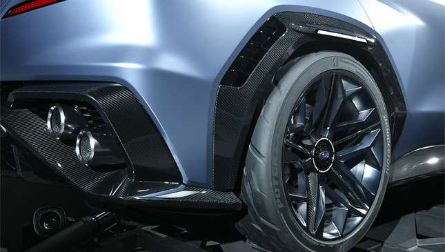 The five-door sedan measures 4,630mm long, 1,950mm wide, and 1,430mm tall, so roughly the same height but slightly shorter and narrower than the current Subaru Impreza. The exterior design is based on the Japanese carmaker's "Dynamic x Solid" design philosophy and draws on cues from the Legacy, Impreza, and WRX. The overall look is sharp lines galore, highlighted by a low center of gravity, muscular carbon fiber fenders, plus more carbon in the roof and bumpers. Underneath are 20in tires.