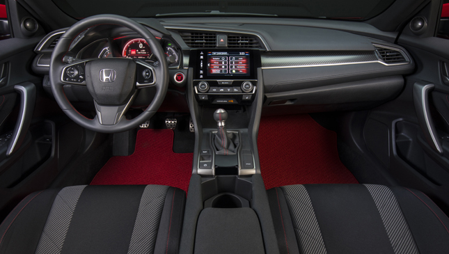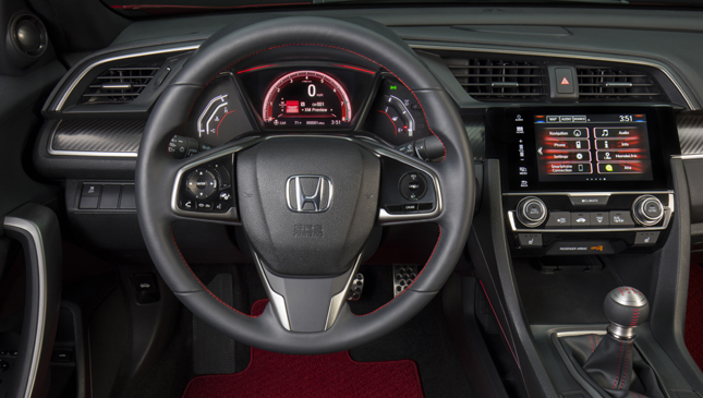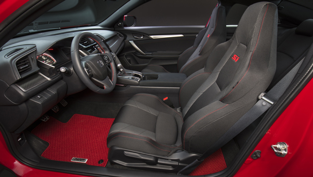 Inside, the Si features exclusive front sports seats, a red TFT meter, aluminum sports pedals, and audio system illumination. Further accentuating the car's sporty demeanor is red stitching on the seats, doors, steering wheels and leather shift boot, as well as a dry metal carbon fiber instrument panel trim. The company says this is a close preview of what to expect inside the production-spec units.