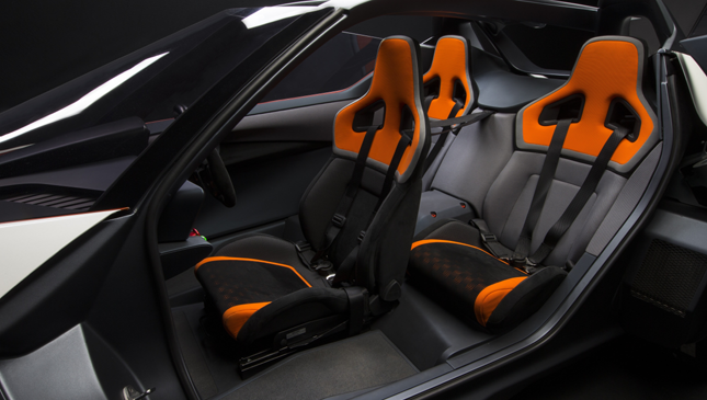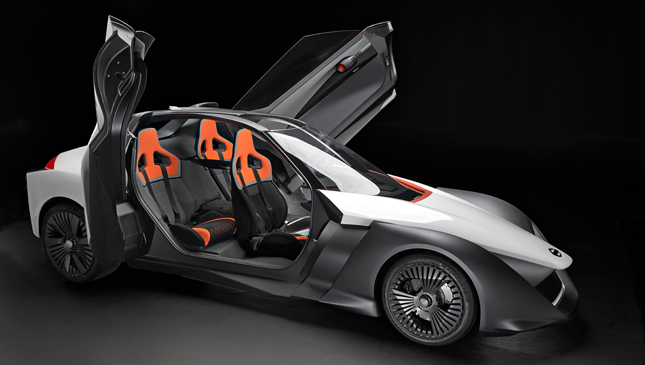 Once inside, occupants are greeted by a futuristic cabin that boasts wheel-mounted controls and gauges that show information like speed, regenerative braking, battery charge, and torque mapping. Then there's the rearview monitor that displays a feed from cameras mounted behind the front wheels. These are meant to replace the conventional rearview mirrors.
