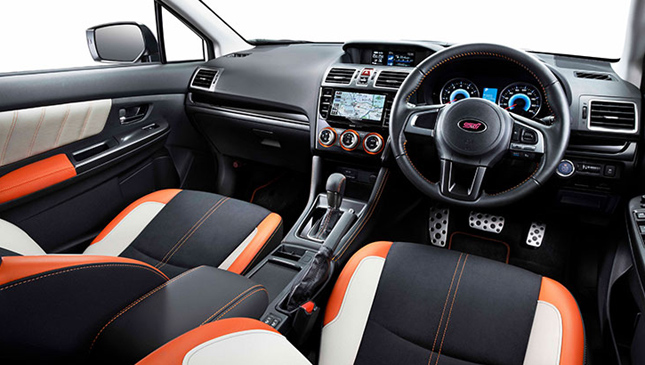 The exterior styling cues are complemented by a cabin with some equally cool niceties. The seats, for instance, bear the STI logo and have seatback heaters. They are covered in Ultrasuede and boast orange/beige highlights with orange stitching. The instrument panel is enhanced with piano-black touches, while the door panels are covered in beige trims with orange accents and armrests. Finally, the front side sills have the STI badge embossed on them.