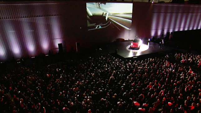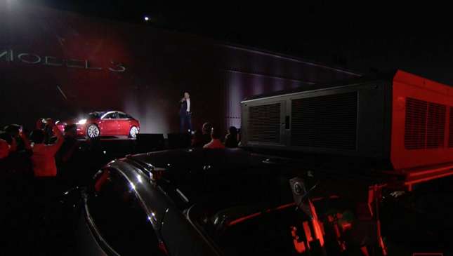 A projector was mounted on the roof of a Tesla Model S and used its battery pack to rifle through Elon's slides. It was beamed onto the side of the outside factory wall.