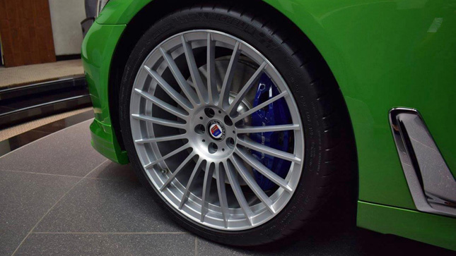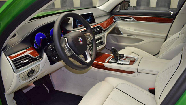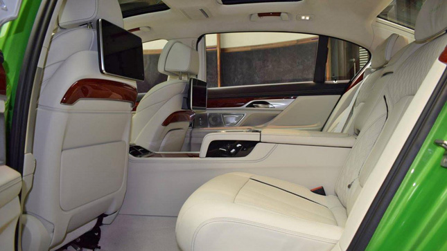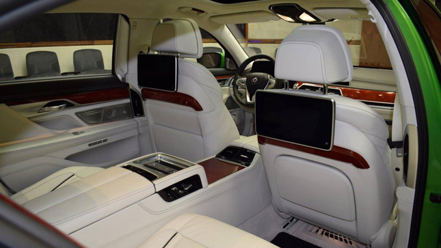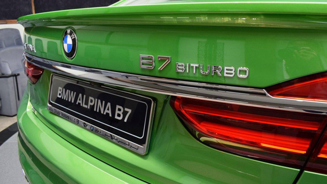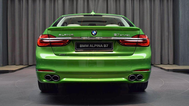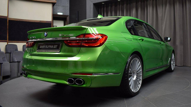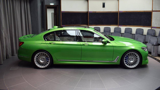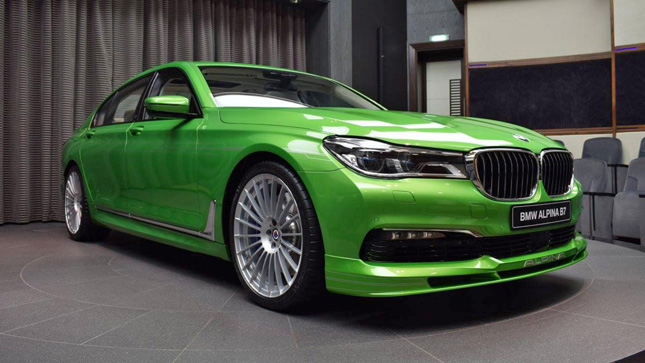 Until it gets painted green. BMW’s Abu Dhabi dealer, having already painted its range of i8 demonstrators in the colors of the rainbow, has taken the Alpina B7 and introduced it to many cans of ‘Java Green’ paint. The result is the Kermit-colored limo before your potentially startled eyes.