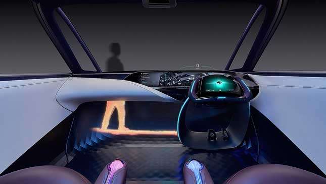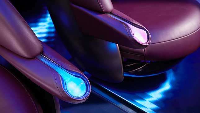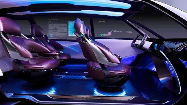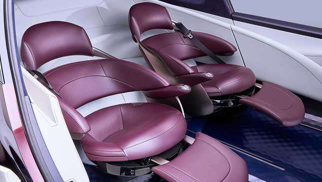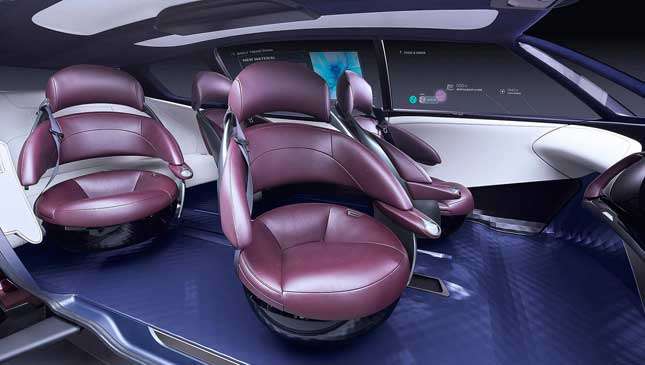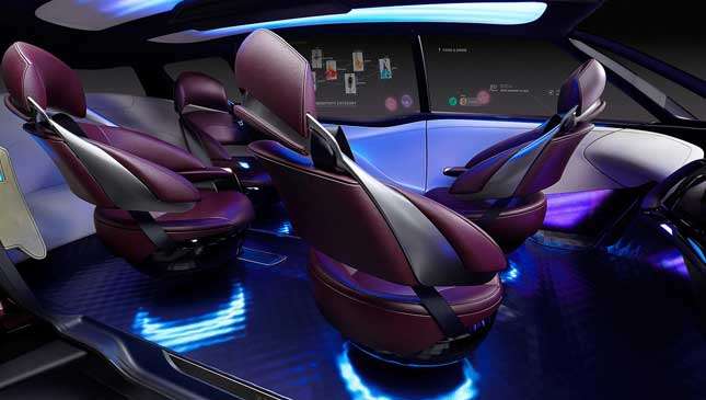 The seats are hugely adjustable to their user’s posture—they appear to be as adjustable as a business class plane seat, with a similarly bold trim—while the interior is free of traditional trim and buttons, with displays galore. Even the windows can be used as screens, it seems.
