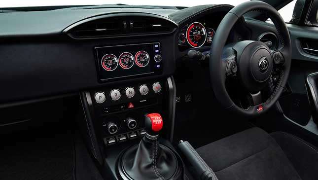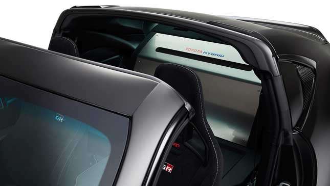 The concept is powered by Toyota Hybrid System-Racing, infused with hybrid tech refined by the aforementioned race car. While it's an automatic, you can switch to manual mode with the push of a button and choose one of six gears through the H-pattern shifter in the middle—just like a regular manual. The hybrid battery is mounted near the center of the car for better weight distribution. The ignition switch, meanwhile, is hidden under a little tab on the shift knob. Ejector seat? You're joking!