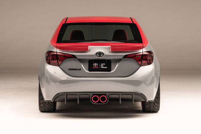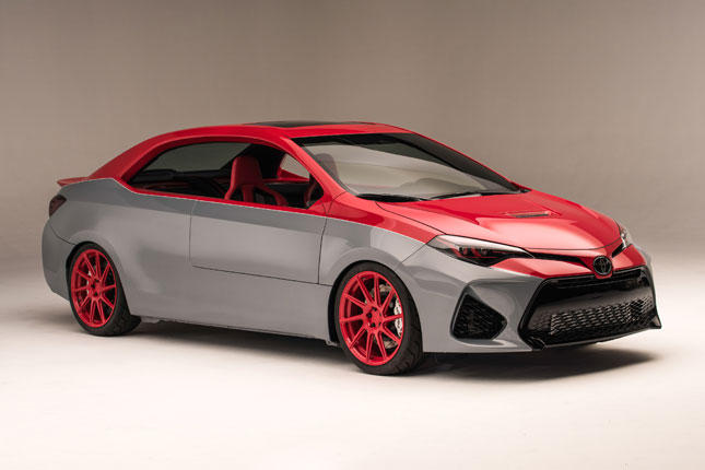 *XTREME Corolla. This unique version of the popular sedan was made in partnership with Jeremy Lookofsky of Cartel Customs. It pays tribute to the Corolla's history while taking cues from the sport compact world. The car has been converted into a turbocharged two-door sports coupe with a stylish color scheme. Inside, it has a floating center console, Sparco seats, and a JBL audio system.