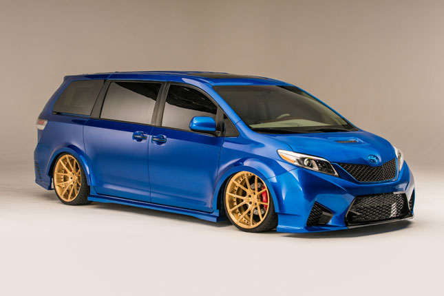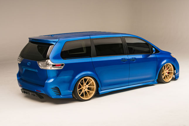 *Extreme Sienna. This version of the 'Swagger Wagon' was created in collaboration with Real Time Automotive’s Rick Leos, and looks like something straight out of the old TV show Pimp My Ride. The Extreme Sienna sports a wide body and carbon fiber additions, along with TRD brakes, performance wheels and tires, a splitter, rear diffuser, spoiler, and dual exhaust. On the inside are luxury items like reclining seats, a home entertainment system, Wi-Fi connectivity, and a bluetooth speaker. Plus, all the features in this Sienna are controlled via an iPad. How's that for swagger?