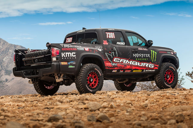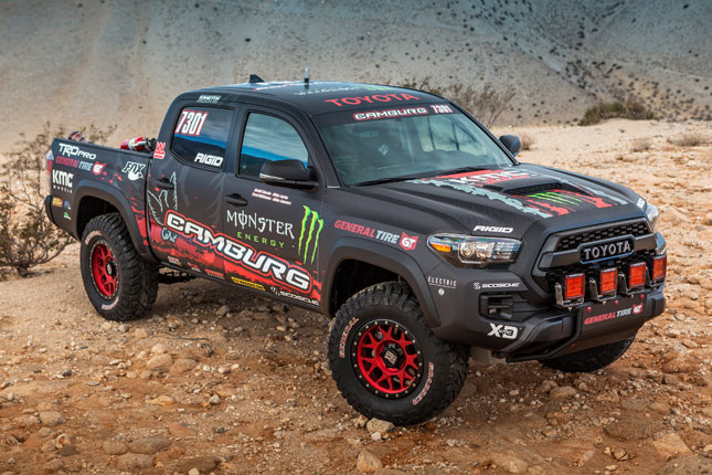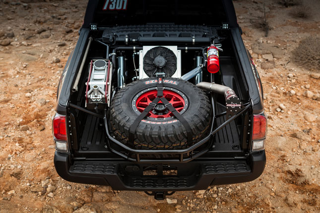 *Tacoma TRD Pro Race Truck. This race-fitted version of Toyota's midsize pickup boasts a beefed-up suspension with Fox 2.5-inch coilovers with remote DSC adjuster, and front and rear Fox three-inch bypass shocks with rear piggyback reservoirs. Toyota plans to put the pickup to the test in the 2017 Mint 400 off-road race.