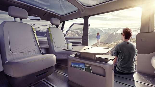 Both interior and exterior make unsubtle hat-tips to VW’s past, with the ability to either seat eight or sleep several inside, and an unmistakable two-tone color scheme outside. It’s about the same size as a VW Touareg, making it larger than previous Microbus-inspired concepts.