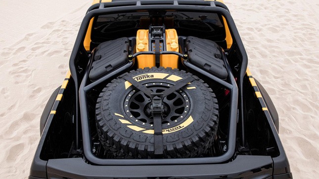 And the makeover continues out the back, with a custom space frame holding spare fuel and recovery gear, as well as a fire extinguisher, should you get things really wrong.