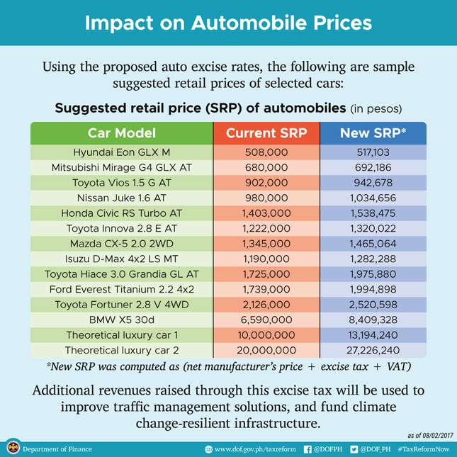 But those interested in the top-spec Fortuner will want to buy now, because it’ll jump to more than P2.5 million. As expected luxury cars will take the brunt of the proposed taxes, with a theoretical P20 million vehicle (Ferraris, Lambos, Astons) costing more then P7 million more.