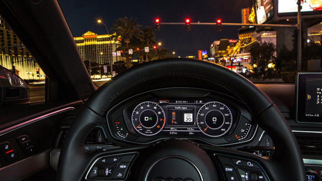 Audi is even trialing V2I (vehicle-to-infrastructure) connectivity in Las Vegas with it’s TLI (traffic light information, above). Cars fitted with the system have indicators that count down to the next green light—meaning drivers aren’t surprised by the change and can throttle back if the next green is a while away. The system also optimizes the phasing of the traffic lights in real-time, leading to potential fuel savings across the board by 15%. Not to mention possible 3am city drives where all the lights magically turn green in front of you.