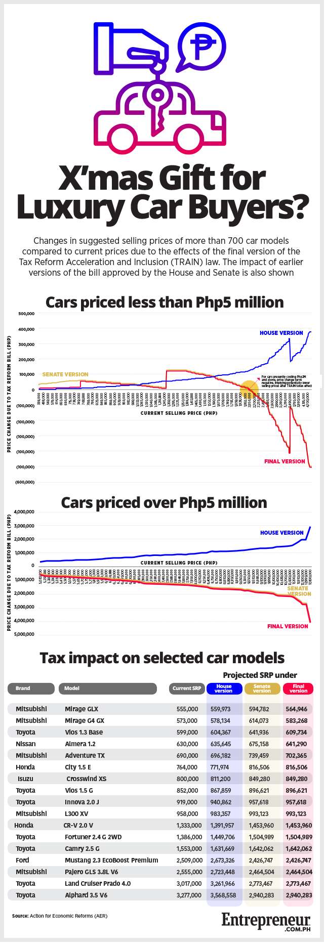 Indeed, analysis by the Action on Economic Reforms (AER), an economic policy and advocacy group that supported the DOF’s tax reform proposals, shows that cars currently costing P2 million or more will probably see a possible cut in prices when the TRAIN law takes into effect (see infographic). President Rodrigo Duterte is expected to sign the tax measure by December 19, allowing it to take effect by early January 2018.