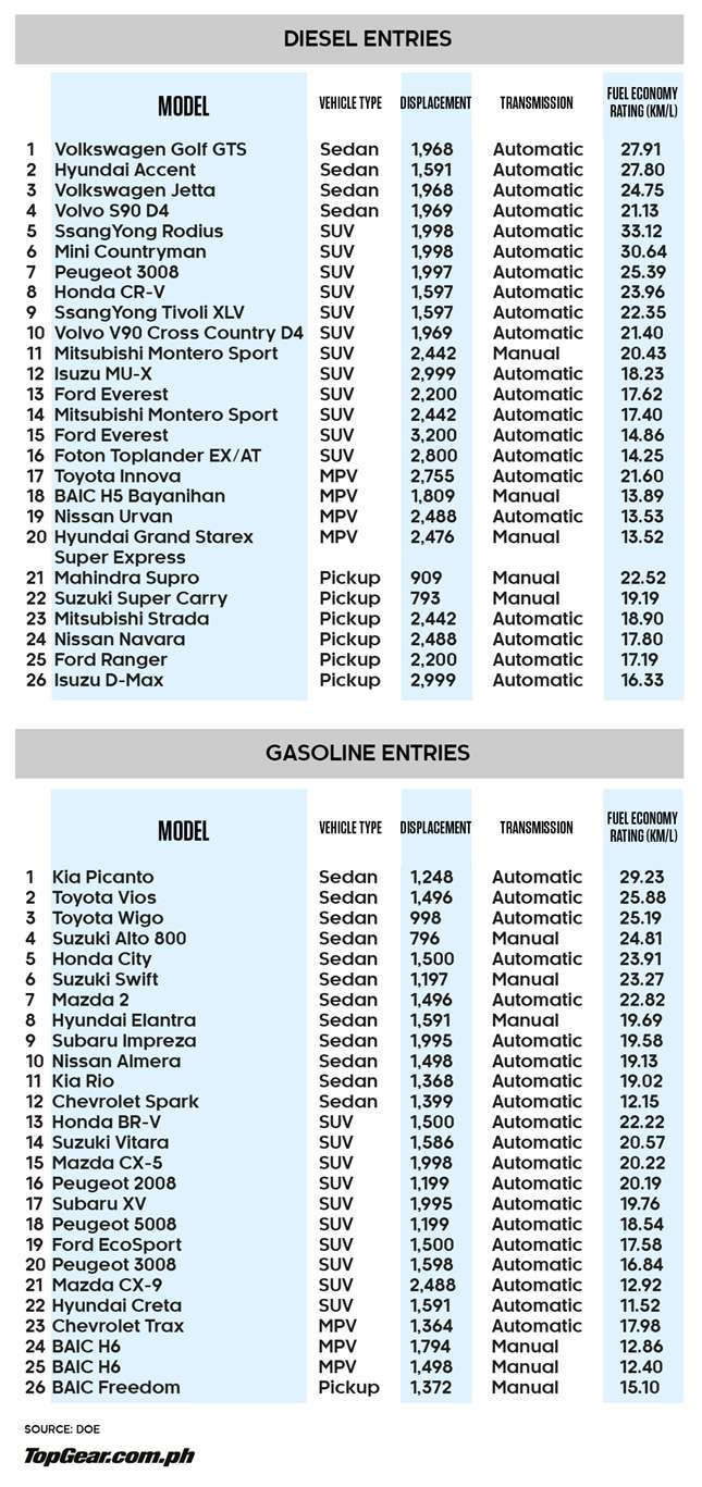 The gasoline category, meanwhile, saw the Kia Picanto beating the other 'sedans' with 29.23km/L. The Honda BR-V got 22.22km/L to win the top spot for SUVs, while the Chevrolet Trax led the MPVs with 17.98km/L. In the pickup segment, the BAIC Freedom ranked first with 15.10km/L.