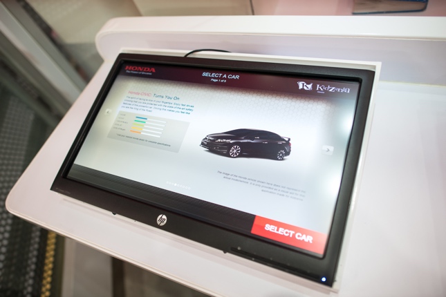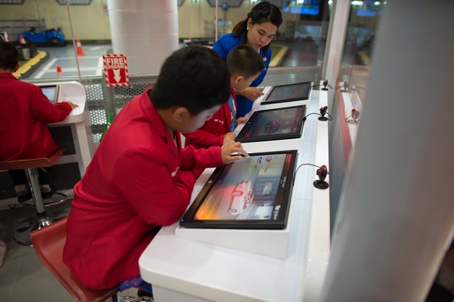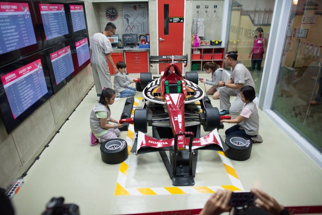 But for us, the more fascinating feature is Honda’s other activity area: the racing pit stop. A mock-up of a very simplified race car is installed in the center of the room, and kids simply try to change the tires as quickly as they can. It's a basic one-lug-nut setup, and instructors time the children to see who has the potential to be a future pit crew member.