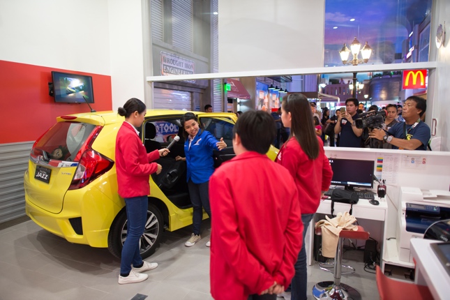 Honda’s corner has a Jazz hatchback on display, and here young ones learn how to be car designers and salespeople. Several boys and girls are chosen from the audience to participate, and they are even given Honda blazers to look the part. Then, using the yellow Jazz, an instructor shows them how to explain a car’s features to potential customers.